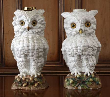 each seated on an acorn encrusted base, with an oil lamp fitting to head (2)