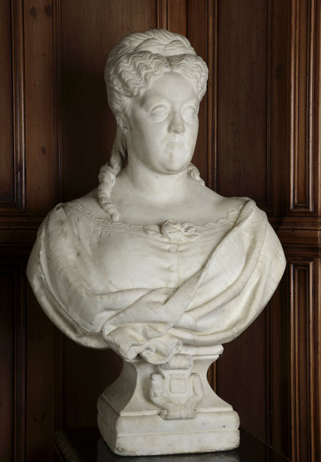 with striped shawl and coat of arms to the waisted pedestal, right side inscribed ‘M. Dieudonne Arles 1877’