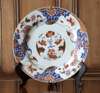 with clobbered decoration, the border with scrolling foliage, the well with figures in a garden (riveted), 35m diameter; a small famille rose oval lobed dish with floral decoration, 21cm wide; A 19th century Masons type hexagonal twin handled bowl, with polychrome chinoiserie floral decoration, 26cm wide; a large Imari palette plate with floral design, 36cm diameter (restored); and a small Kutani vase (5)