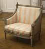 of Louis XV style, each with moulded toprail with acorn finials, the back, arms and seat cushion covered in striped fabric, outscrolled arms with rosette terminals, on stop fluted turned tapering legs (2)