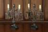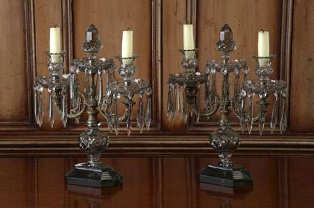 each with leaf cast scroll arms with dished drip pans and waisted sconces, on facetted stepped glass base (2)