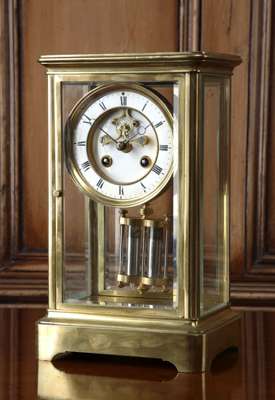 the twin train movement striking on a bell, with mercury filled pendulum, the circular white enamelled dial with Roman numerals and central visible Brocot escapement, the moulded rounded rectangular top above bevelled rectangular glazed door, on plinth base with bracket feet