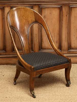the arched moulded back with tapering backsplat flanked by downswept supports, the upholstered drop in seat on square sabre legs with brass caps and castors