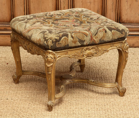 each with square seat covered in close nailed swan, torch and floral fabric, above shaped apron with shell and acanthus carved centre to each side, on channelled cabriole legs wth scrolled toupee feet, joined by a shaped X-stretcher, one stamped ‘Quignon & Fils, Paris’ to the underside (2)