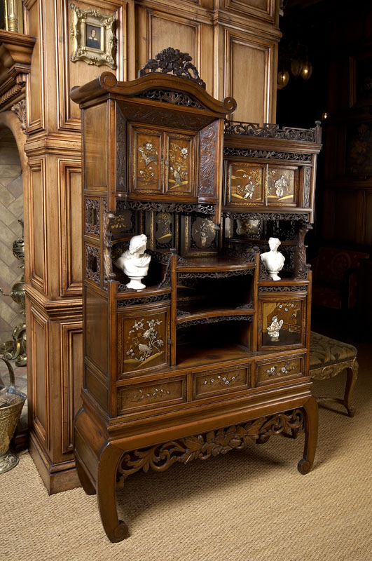the top with scrolled cresting with floral carved surmount to one side, pierced foliate scroll carved gallery to the other, above two cupboard doors decorated with birds in flowering branches, beside two sliding doors decorated with figures in landscapes, above a series of open shelves with pierced foliate scroll carved galleries, spandrels and aprons, pierced decorated cartouches behind, over two bird and figure decorated bowed cupboard doors and three frieze drawers, on moulded base with pierced foliate carved apron, on inscrolled legs and feet