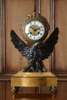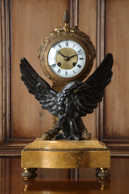 the twin train movement strking on a bell, the circular dial with engine turned centre and white enamelled Roman chapter ring, in finialled foliate cast drum case above a cast eagle with wings spread, on serpentine stepped yellow marble base with acanthus cast turned feet