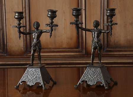 modelled as Nubian boys, each holding aloft a pair of torcheres with leafy drip pans and sconces, on quatreform outsplayed base with arabesque panels and claw feet (2)