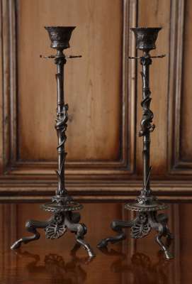 each with trailing leaf and gadrooned sconce above fleur de lys drip pan and bamboo stem, one with lizard ascending, the other with lizard descending, on triple anthemion and stylised horse leg base, stamped ‘F Barbedienne’ to undersides (2)