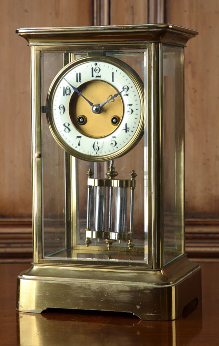 the twin train movement striking on a bell, with mercury filled pendulum, the circular white enamelled dial with Arabic numerals and recessed brass centre, the moulded rounded rectangular top above bevelled rectangular glazed door, on plinth base with bracket feet