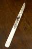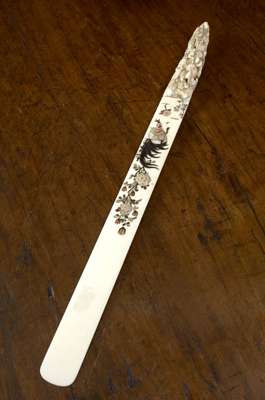 the ivory handle ornately carved with shells, an octopus, trellis work and leaves, the ivory turner inlaid with a cockerel and chrysanthemums to one side and floral blossom with butterflies to the reverse