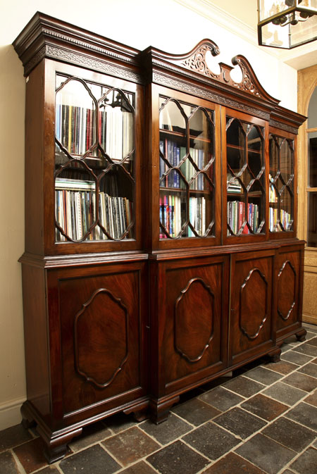 the pierced moulded swan neck pediment with central plinth, above moulded dentilled cornice and blind fretwork frieze, over four astragal glazed doors, enclosing adjustable shelves, the projecting lower section with four moulded panelled cupboard doors, enclosing shelves, on ogee bracket feet