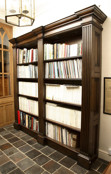 the moulded cornice above plain frieze and open adjustable shelves between fluted columns, on moulded plinth base