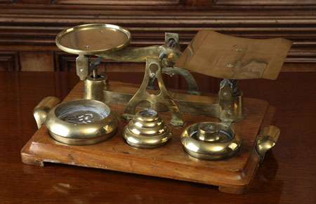 with six Avery weights, weighing pan marked ‘INLAND PARCEL POST RATES’, listed below, mounted on a mahogany base with brass carrying handles