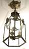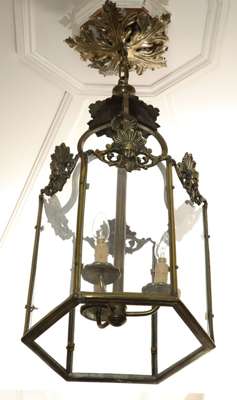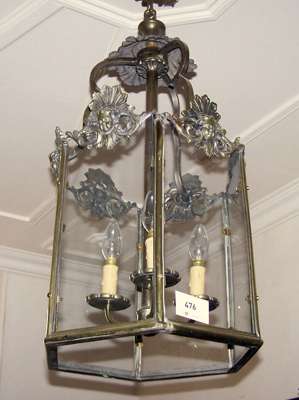 of Louis XV style, of hexagonal glazed form, with cherub mask and scroll surmounts to each section