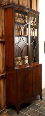 the top with fluted frieze with rosettes to the centre and corners, above two astragal glazed doors, enclosing shelves, the projecting base with two oval inlaid panelled cupboard doors, enclosing a shelf, shaped apron, on spreading bracket feet, alterations