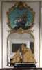 the arched mirror plate with circular painted panel of a basket of flowers above, in acanthus moulding and white painted frame