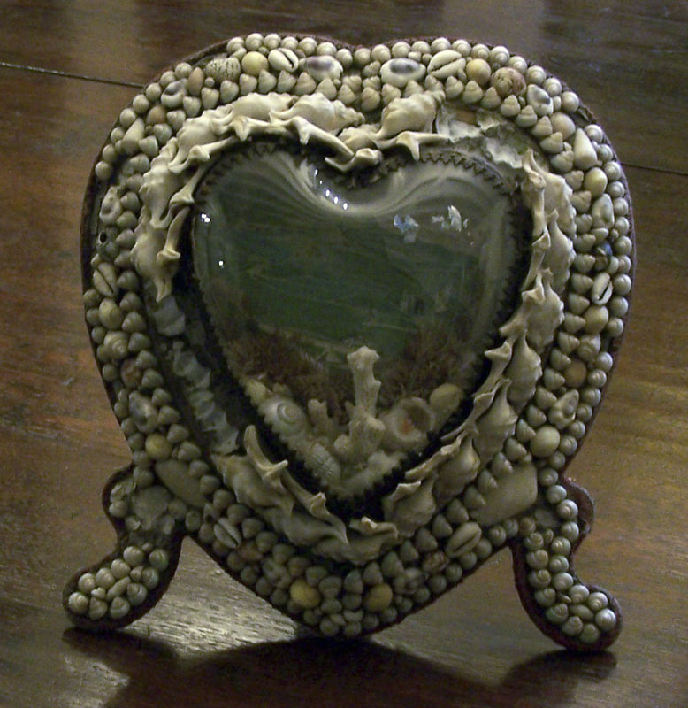 heart shaped, with splayed feet, containing a landscape print and coral shells etc