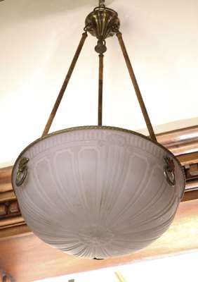 the large dished bowl with fluted and lobed decoration, with triple leaf cast ring handles