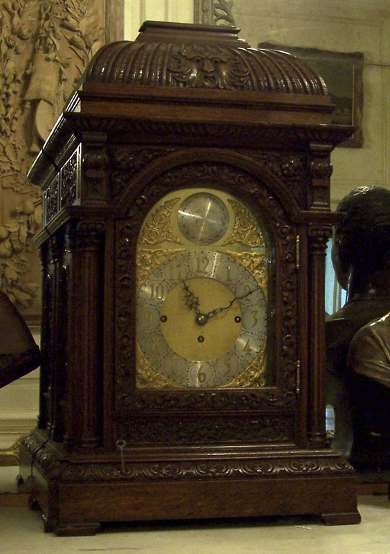 the fusee movement striking on a bell and coiled gong, the brass dial with cast spandrels and silvered chapter ring with Arabic numerals, the case with foliate carved stop fluted cushion top centred by a mask, the arched glazed door with putto carved spandrels and flanked by fluted Corinthian columns, on carved plinth with bracket feet