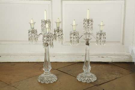 the petal shaped nozzles mounted on upswept arm issuing from a faceted baluster stem, on circular base (one damaged arm) (2)