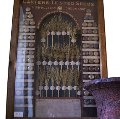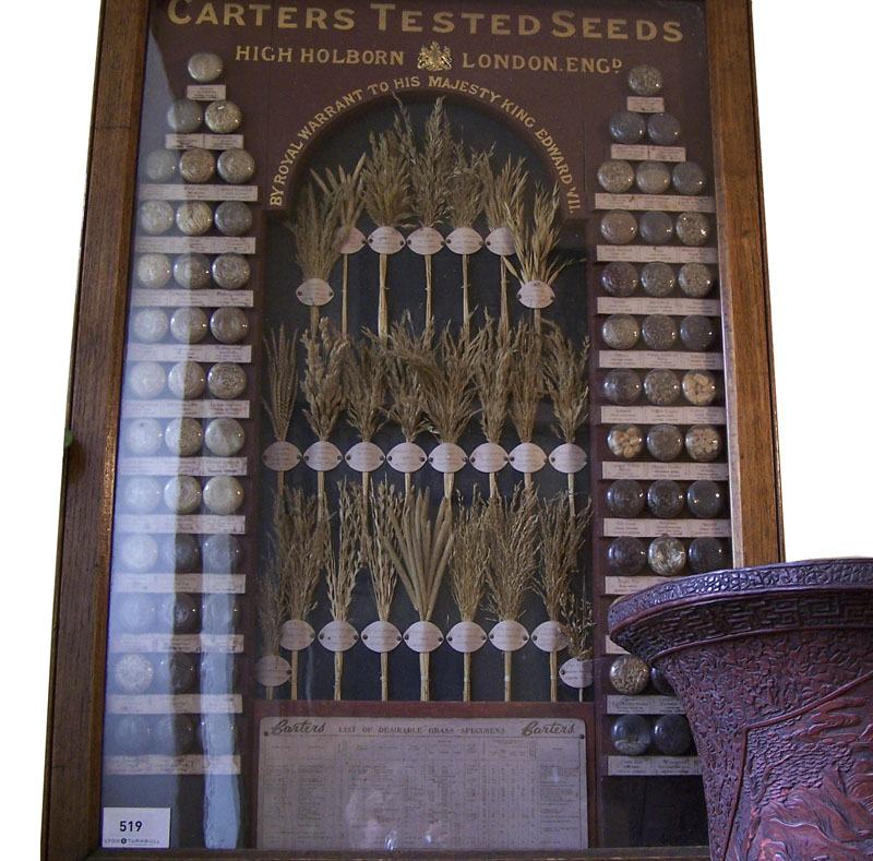 the oak frame including labelled specimens and central heading ‘Carters Tested Seeds, High Holborn, London, England, by Royal Warrant to his Majesty King Edward VII’