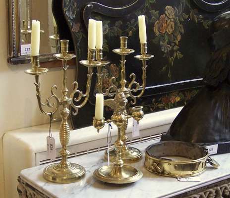the knopped stem supporting a pair of ball nozzles with detachable sconces, centred by an owl with outspread wings and lidded head; and a pair of brass three light candlesticks, 42cm high (3)