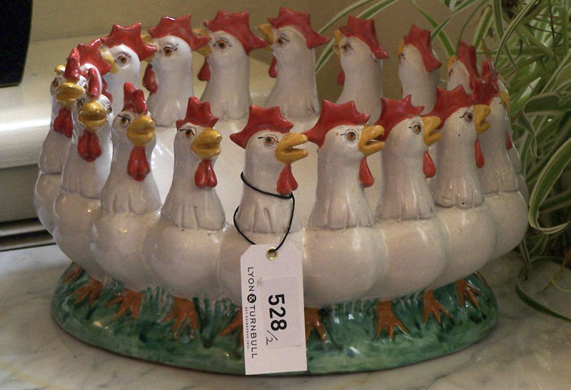 formed as multiple white hens looking left, green base, modern, 27cm diameter; and a similar goose dish, 25cm diameter (in kitchen) (2)