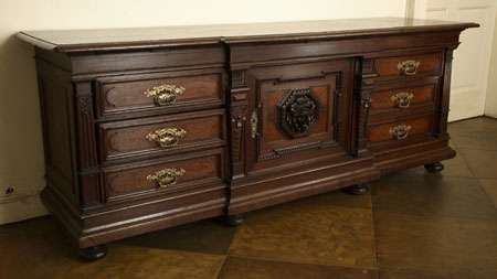 the moulded breakfront rectangular top above a central panelled door with relief carved mask, flanked on each side by square demi columns and three drawers, on moulded plinth base with squat bun feet