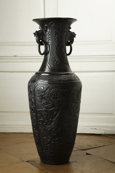 of Oriental style, of waisted baluster form, with stylised dragon and hoop handles