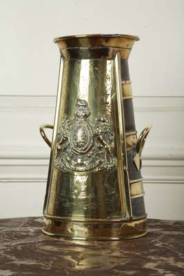 front with raised brass coat of arms and inscribed, ‘PURE MILK E. BURNARD MAKER HOLYWELL LANE SHOREDITCH’, with brass carrying handles, lid lacking