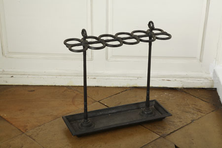 the foliate cast hooped top on two columns with spreading circular bases, raised rectangular drip tray