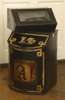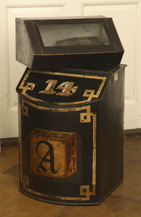 the sloping hinged lid painted in gilt with the number 14, above bow front with the letter A in gilt panel, Chinese script behind, 48cm wide, 67cm high, 47cm deep; and a toleware box, with glazed sloping lid, 50cm wide (2)