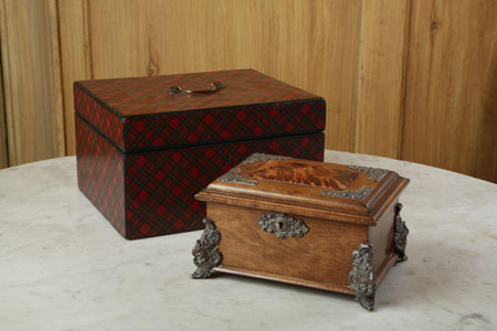 Stuart tartan, with brass loop handle, 29cm wide; and a German walnut box, with tortoiseshell panel and silvered mounts, 23cm wide (2)