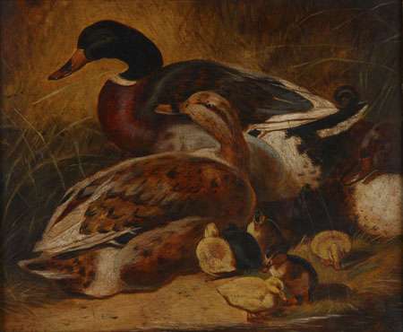 DUCKS AND DUCKLINGS ON A RIVERBANK