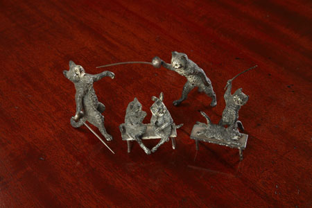 each approximately 6cm high; two cats on a bench; and one cat punishing another with a cane