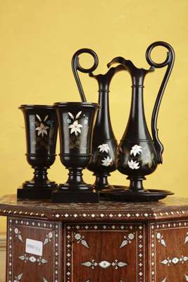 each with fluted lip and scroll handle, on dish base, 27cm high; and a pair of similar spill vases, 16cm high (4)