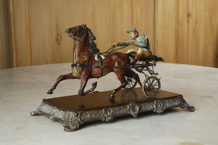 A late 19th/early 20th century cold painted bronze group of a jockey and gig