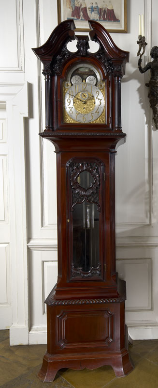 the triple train movement striking on chime bars, the engraved brass dial with cast spandrels and silvered chapter ring with Arabic numerals, subsidiary seconds, chime/silent and chime on 8 bells/Cambridge chimes dials, painted moonphase dial to the arch, the hood with swan neck pediment above foliate carved spandrels and arched glazed door flanked by fluted columns, the case with carved and glazed trunk door, enclosing a mercury filled pendulum, flanked by fluted chamfered corners, on moulded panelled base with gadrooned edge, on spreading bracket feet with shaped apron
