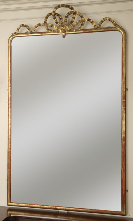 the rounded rectangular mirror plate in plain moulded frame with carved ribbon tied surmount