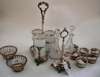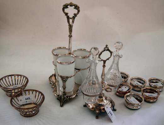 now with three milky glass beakers; together with a plated bottle stand, of circular form and with two cut crystal bottles with stoppers; six small bottle coasters; and a pair of Sheffield plated wire baskets with beaded border (10)