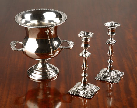 of George III style style, each with serpentine form base, knopped column; together with a pair of baluster candlesticks; and a plated campana shaped two handled wine cooler (5)