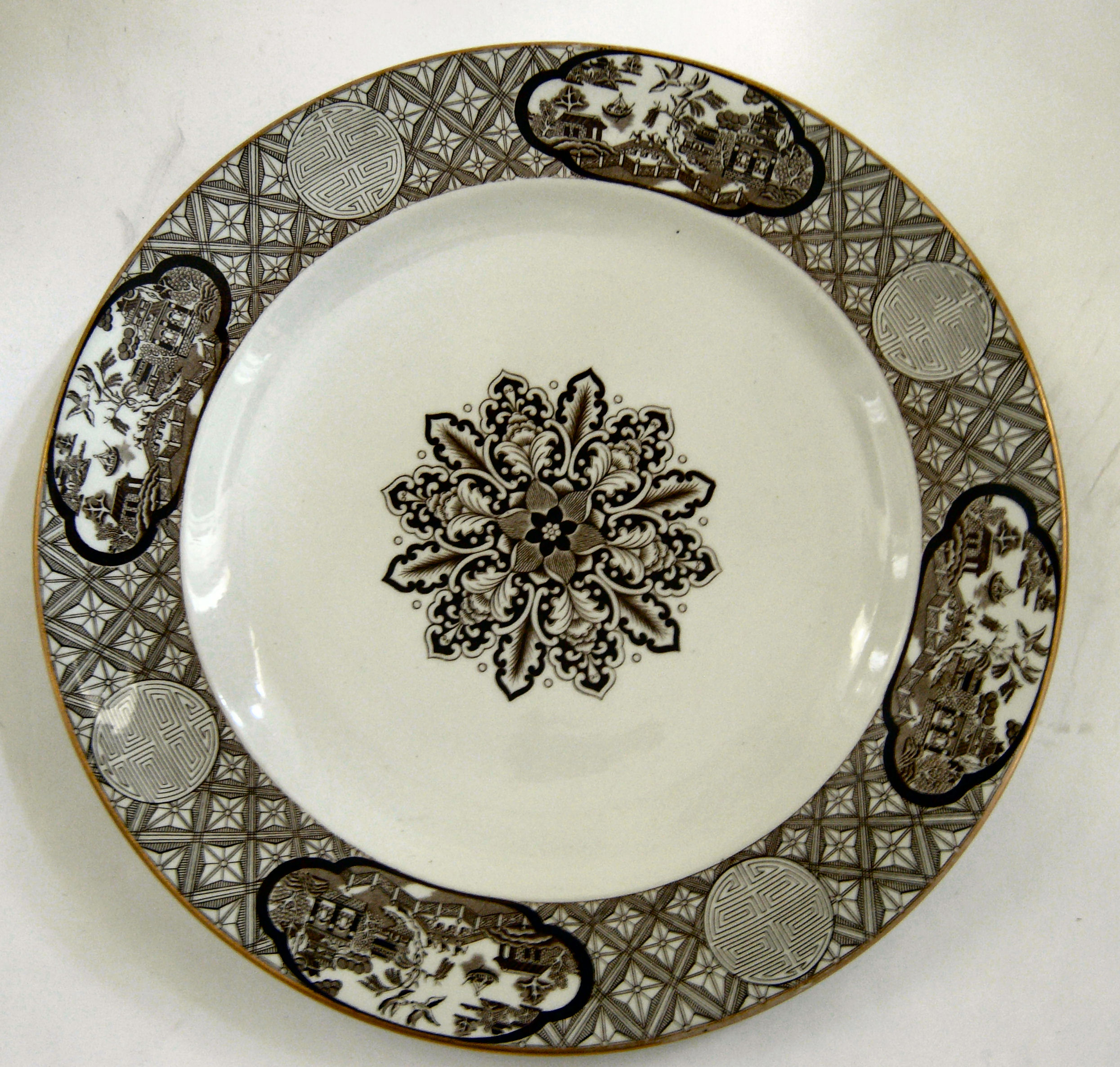 brown printed with geometric pattern, circular ‘mon’ design, chinoiserie cartouche panels and central stylised flower to the well, comprising: a large ovoid tureen and cover, two vegetable tureens and covers, two sauce tureens and covers, ten graduated ashets; thirty-four meat plates, 27cm diameter; twenty-one fish plates; five side plates; and twelve dessert bowls, brown printed Worcester mark for 1884, and brown printed registration mark (a quantity)