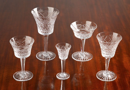 comprising: ten claret glasses; ten hock glasses; eleven wine glasses; ten champagne glasses; and nine sherry glasses (50)