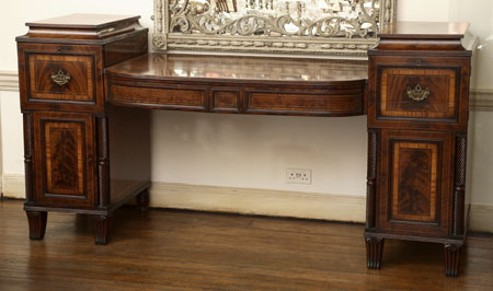 satinwood crossbanded and boxwood line inlaid overall, the D-shaped reeded centre section with two moulded frieze drawers, flanked on each side by a pedestal with reeded rectangular caddy top above two moulded cupboard doors, the lower flanked by spirally reeded columns, on reeded short sabre legs
