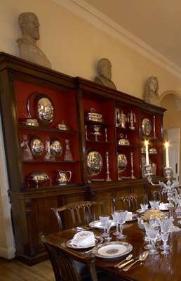 the moulded cornice above plain frieze and open adjustable shelves between recessed foliate carved headed and footed columns, the projecting base with plain frieze above panelled cupboard doors between similar columns, on moulded plinth base