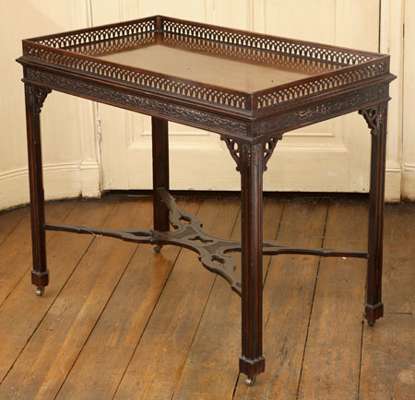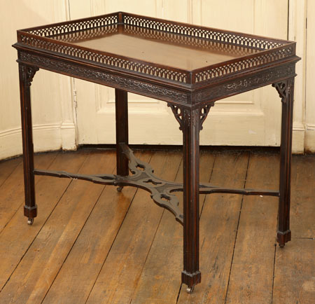 of George III style, the rectangular top with open fretwork gallery, above blind fretwork frieze, on channelled chamfered legs with pierced spandrels and block feet, joined by shaped pierced X-stretcher, on brass castors