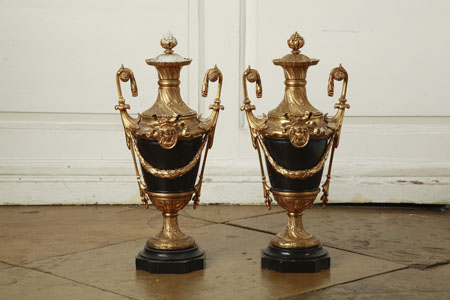 of Louis XV style, each with ribbon tied portrait medallion and foliate leaf scroll handles, on octagonal concave base (2)