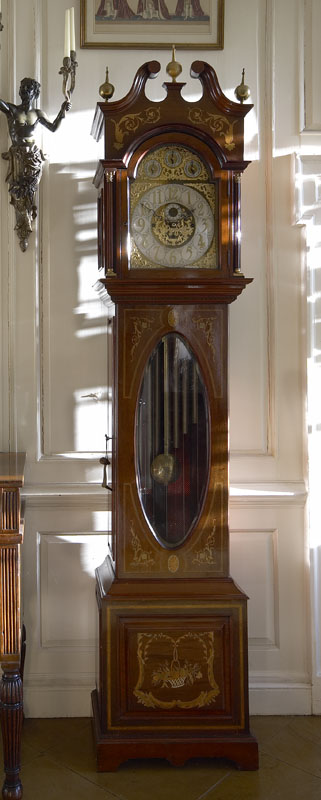 the triple train movement striking on chime bars, the brass dial with cast spandrels and centre, silvered chapter ring with Arabic numerals and subsidiary seconds dial, strike/silent, chime/silent and Whittington chime/Westminster chime dials to the arch, the hood with swan neck pediment and brass ball finials above marquetry acanthus scroll spandrels and arched glazed door flanked by fluted Corinthian columns, the trunk door with bevelled oval glazed panel surrounded by crossbanded marquetry acanthus scroll panels and with paterae above and below, on moulded crossbanded panelled base with marquetry basket of flowers, on bracket feet