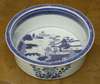 of circular form with flared rim, blue painted, the well decorated with a house, river crossed by a bridge and trees (damages)