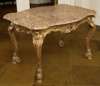of early 18th century style, the red and yellow marble moulded serpentine rectangular top above a shaped frieze centred by a carved and pierced shell to each side, on acanthus carved cabriole legs with hairy hoof feet